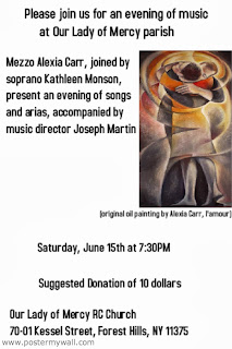 If you have followed my blog posts, you should remember that I mentioned last month that when I was painting the arched entrance of Forest Gardens, a French leading opera singer stopped by and asked me for information of art supplies stores. That was Alexia Carr. At that time, she was in this country only for a few days. She happened to be a fine artist, too. If you scrolled down, you will see the church event post with her own painting on it.